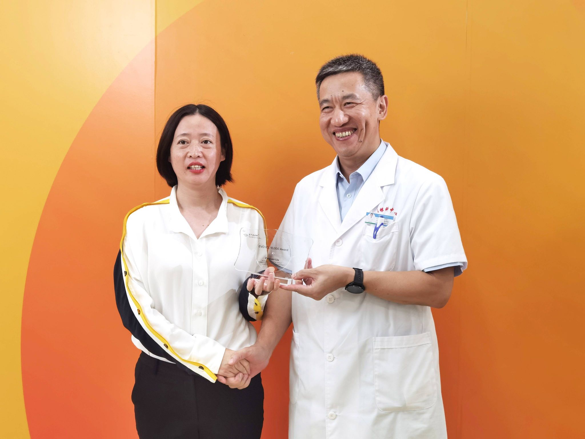9月22日下午,EVO ICL官方研發(fā)機(jī)構(gòu)STAAR Surgical公司代表為廈門(mén)眼科中心業(yè)務(wù)副院長(zhǎng)、ICL核心專(zhuān)家委員會(huì)首屆委員劉才遠(yuǎn)教授頒發(fā)了『EVO ICL 10000 例』獎(jiǎng)?wù)拢员碚闷銲CL晶體植入量正式突破10000例。