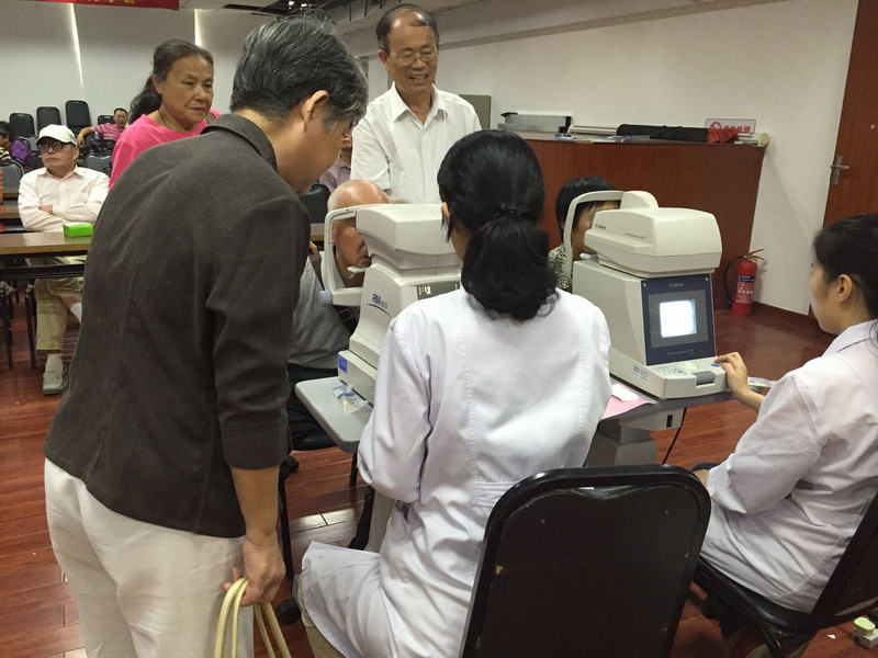 毛祖紅醫(yī)生用裂隙燈現(xiàn)場(chǎng)患者檢查眼壓、驗(yàn)光