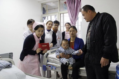 由于小燦寶家境不好,全家九口人,上面有年邁的爺爺奶奶,加上小燦寶兩兄弟,小燦寶媽媽要照顧兩個(gè)年幼的孩子無(wú)法工作,另外,小燦寶大伯幾年前去世,小燦寶大伯母離家未歸,大伯家的三個(gè)孩子也是小燦寶父母代為照顧,九口人只有小燦寶爸爸工作養(yǎng)家。護(hù)士梁嘉惠了解到情況后,與護(hù)士長(zhǎng)陳秋蓮商量在微信朋友圈發(fā)起愛(ài)心捐款。經(jīng)過(guò)三天募集,一共募集到9926元善款。