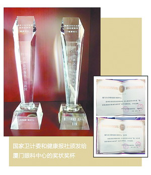 國家衛(wèi)計委和健康報社頒發(fā)給廈門眼科中心的獎狀和獎杯。