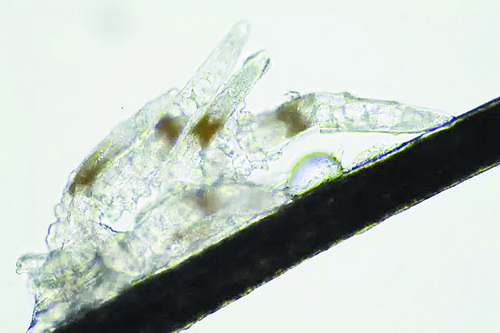 顯微鏡下長(zhǎng)在睫毛中的螨蟲(chóng)