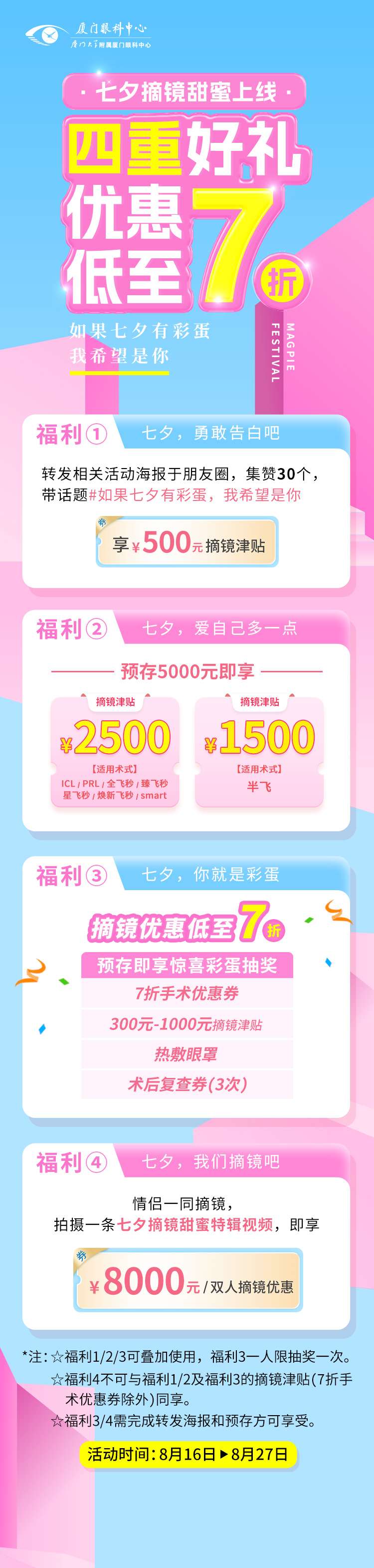 活動期內(nèi),預(yù)存5000元,半飛秒可享1500元摘鏡津貼;ICL/PRL/全飛秒/煥新飛秒/臻飛秒/星飛秒/Smart可享2500元摘鏡津貼。