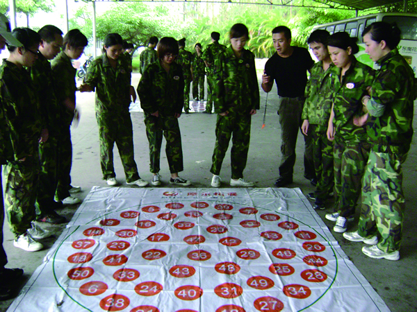 一張印有50個(gè)豪無規(guī)律數(shù)字的塑料毯,項(xiàng)目要求團(tuán)隊(duì)在最快的時(shí)間里按1~50的順序踩數(shù)字,同時(shí)不能踩到毯子以及毯子上方不能同時(shí)出現(xiàn)兩只腳,否則要重新開始。在這項(xiàng)目中我們的“必勝莊園隊(duì)”認(rèn)真思考,仔細(xì)研究塑料毯上看似無規(guī)律的數(shù)字其實(shí)也不是完全沒有規(guī)律的,上方的數(shù)字?jǐn)[放比較稀疏,左右兩側(cè)和下方會(huì)相對(duì)密集。于是他們根據(jù)數(shù)字的規(guī)律調(diào)整人員分布,左右兩側(cè)和下方盡量多些人,大家手拉手互相扶持。果然,很有效率,輕輕松松地完成并以較短時(shí)間戰(zhàn)勝。而“勇者無敵隊(duì)”,由于沒有講究方法進(jìn)行協(xié)條分工,是幾個(gè)人輪流踩數(shù)字,一直圍繞著毯子在跑與踩。幾輪下來,一個(gè)個(gè)滿頭大汗,也筋疲力盡,結(jié)果還是以戰(zhàn)敗告終。