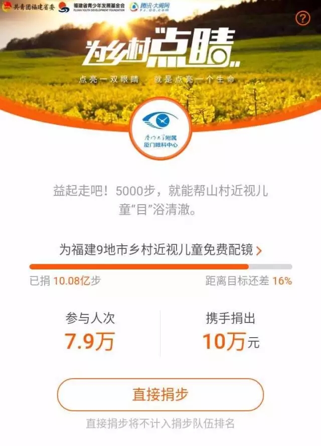 全民暴走,以5000步為起捐門檻,網(wǎng)友捐出的每一次5000步,廈門大學(xué)附屬?gòu)B門眼科中心都將捐出相應(yīng)的配捐資金。目前,已為福建9地市鄉(xiāng)村近視兒童配鏡累計(jì)捐出10億步,為近視兒童捐出10萬(wàn)元。