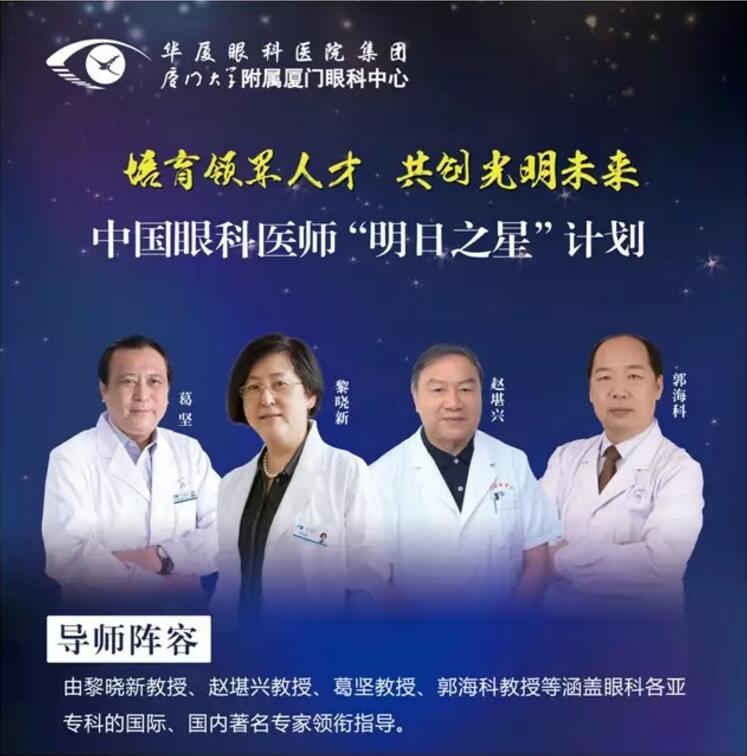 中國眼科醫(yī)師“明日之星”計劃由廈門大學附屬廈門眼科中心總院長、國際眼科科學院院士、中華醫(yī)學會眼科學分會原主任委員、北京大學人民醫(yī)院原副院長黎曉新教授,華廈眼科醫(yī)院集團專家委員會主席、國際眼科科學院院士、亞太地區(qū)斜視與小兒眼科學會副主席、中華醫(yī)學會眼科學分會前任主任委員、中國醫(yī)師協(xié)會眼科醫(yī)師分會會長趙堪興教授,華廈眼科醫(yī)院集團戰(zhàn)略發(fā)展與學術委員會主任、中華醫(yī)學會眼科學分會名譽主任委員、原中山大學中山眼科中心主任暨眼科醫(yī)院院長葛堅教授,中華醫(yī)學會眼科學分會專家會員、華廈眼科醫(yī)院集團業(yè)務副總院長、廈門大學附屬廈門眼科中心業(yè)務院長、上海和平眼科醫(yī)院院長郭??平淌诘冉倜T士、博士研究生導師組成強大的導師陣容。