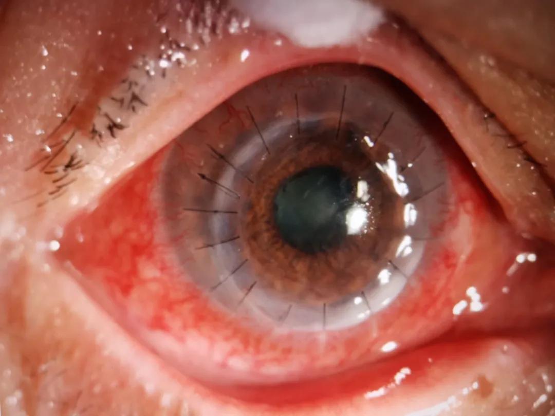老楊右眼術前熒光造影照片—紅色圓圈中黑色區(qū)域為角膜穿孔的部分