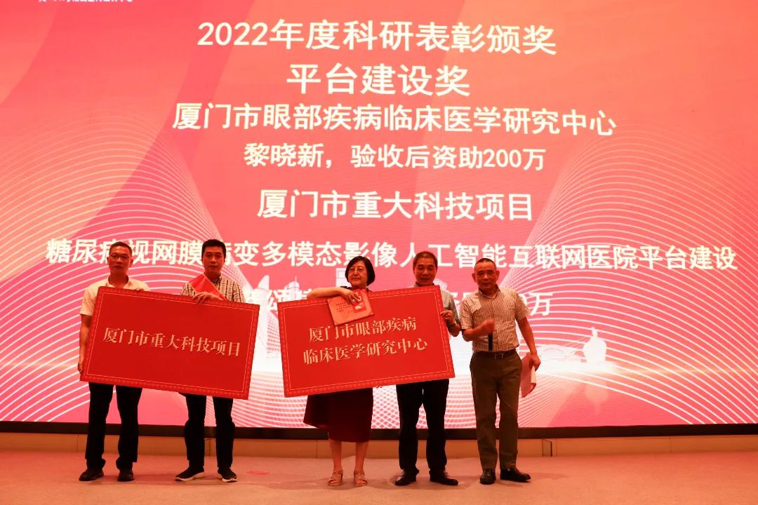 會上,2022年度科研表彰頒獎盛典同步舉行。2022年度,我院科研工作再結(jié)碩果,醫(yī)院學(xué)術(shù)品牌的影響力和號召力得到進(jìn)一步提升。我院獲批成為廈門市眼部疾病臨床醫(yī)學(xué)研究中心,榮登2022年度中國醫(yī)院科技量值(眼科學(xué))榜單,并連續(xù)十年衛(wèi)冕福建省眼科學(xué)第 一,實力領(lǐng)跑。