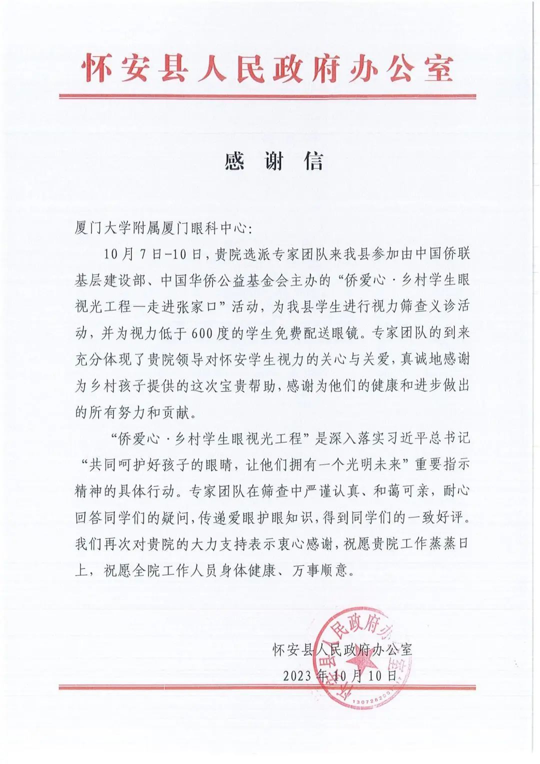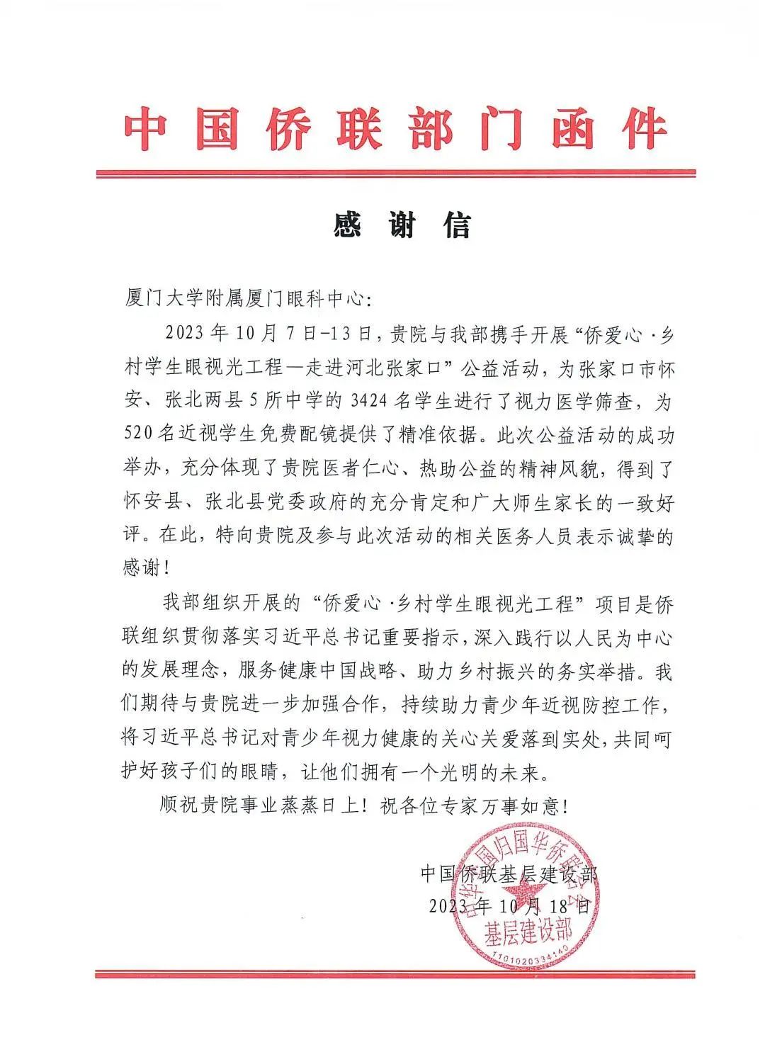 近日,廈門眼科中心接連收到來自中國僑聯(lián)基層建設(shè)部、懷安縣和張北縣人民政府辦公室的三封感謝信,信中對(duì)廈門眼科中心在“僑愛心·鄉(xiāng)村學(xué)生眼視光工程-走進(jìn)河北張家口”公益活動(dòng)中的無私付出及對(duì)鄉(xiāng)村孩子的寶貴的幫助給予充分認(rèn)可與真摯感謝。