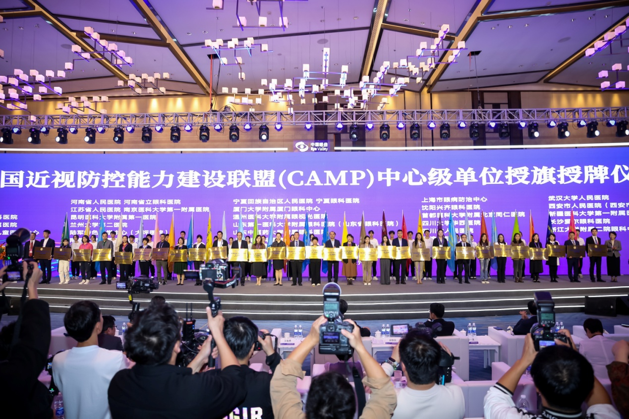 ▲ 中國(guó)近視防控能力建設(shè)聯(lián)盟中心級(jí)單位授牌授旗儀式