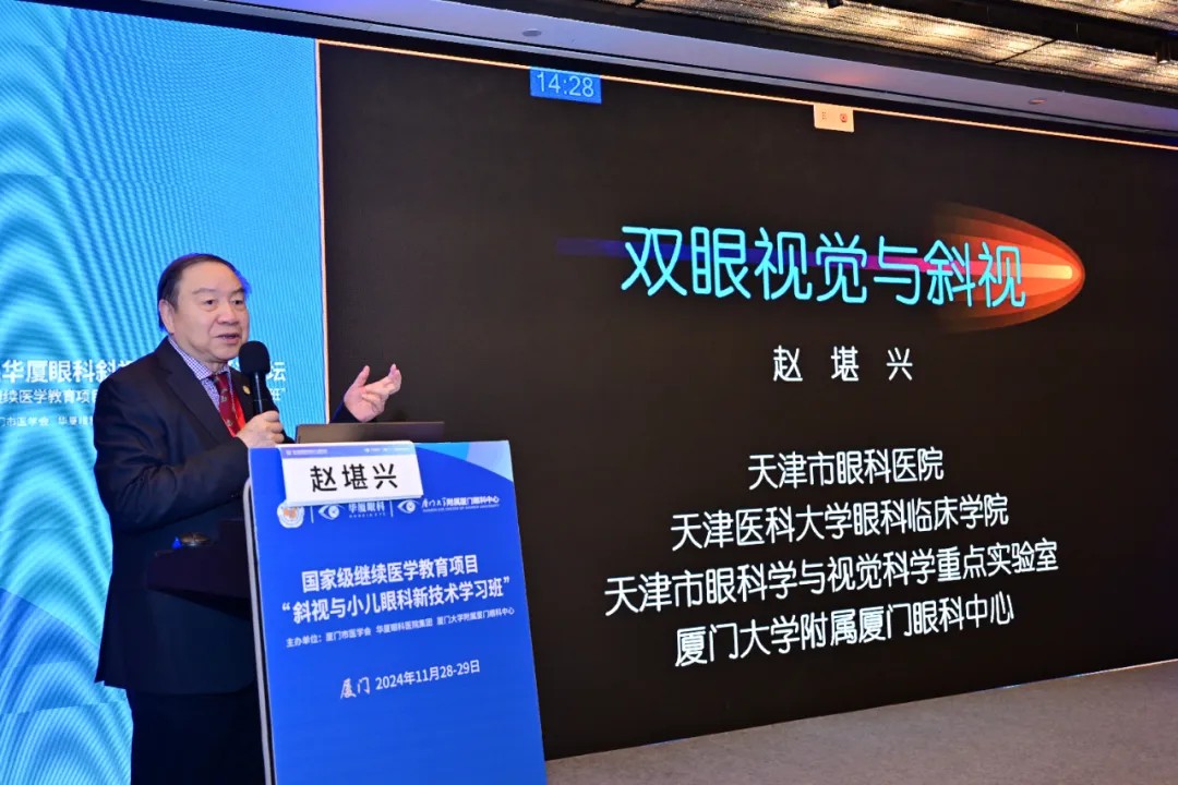開幕式后,國際眼科科學(xué)院院士、華廈眼科醫(yī)院集團專家委員會主席趙堪興教授及國際眼科科學(xué)院院士、廈門眼科中心總院長黎曉新教授率先開啟了精彩的專題學(xué)術(shù)分享。趙堪興教授以《雙眼視覺與斜視》為主題,深入講解了雙眼視覺的生理機制、發(fā)育及其障礙,提出在兒童眼疾的臨床診療過程中要結(jié)合雙眼視的實際情況詳細(xì)分析病情,明確診斷后進行個性化診療。黎曉新教授以《雙側(cè)RB的第二只眼治療》為題,結(jié)合多個臨床案例,詳細(xì)介紹了視網(wǎng)膜母細(xì)胞瘤第二只眼的診療要點難點及治療方法,并分享了新技術(shù)“釕核素放射熱敷貼”對于RB第二只眼的治療效果。