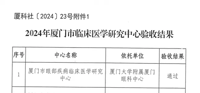 廈門眼科中心閃耀“【文章導讀】日前,廈門市科學技術局對廈門市5家疾病臨床醫(yī)學研究中心開展了驗收,經(jīng)過層層嚴格評選、現(xiàn)場答辯和實地考察后,我院建設的眼部疾病臨床醫(yī)學研究中心成功通過驗收! 廈門市眼