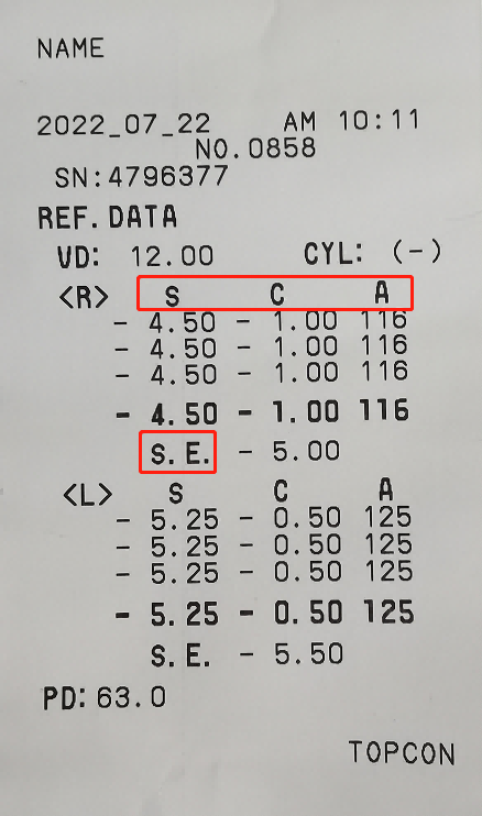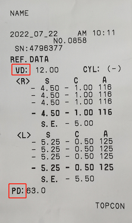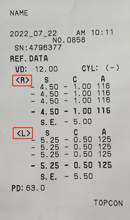 右眼450度近視,100度散光,散光軸位116;左眼525度近視,50度散光,散光軸位125;瞳距:63mm